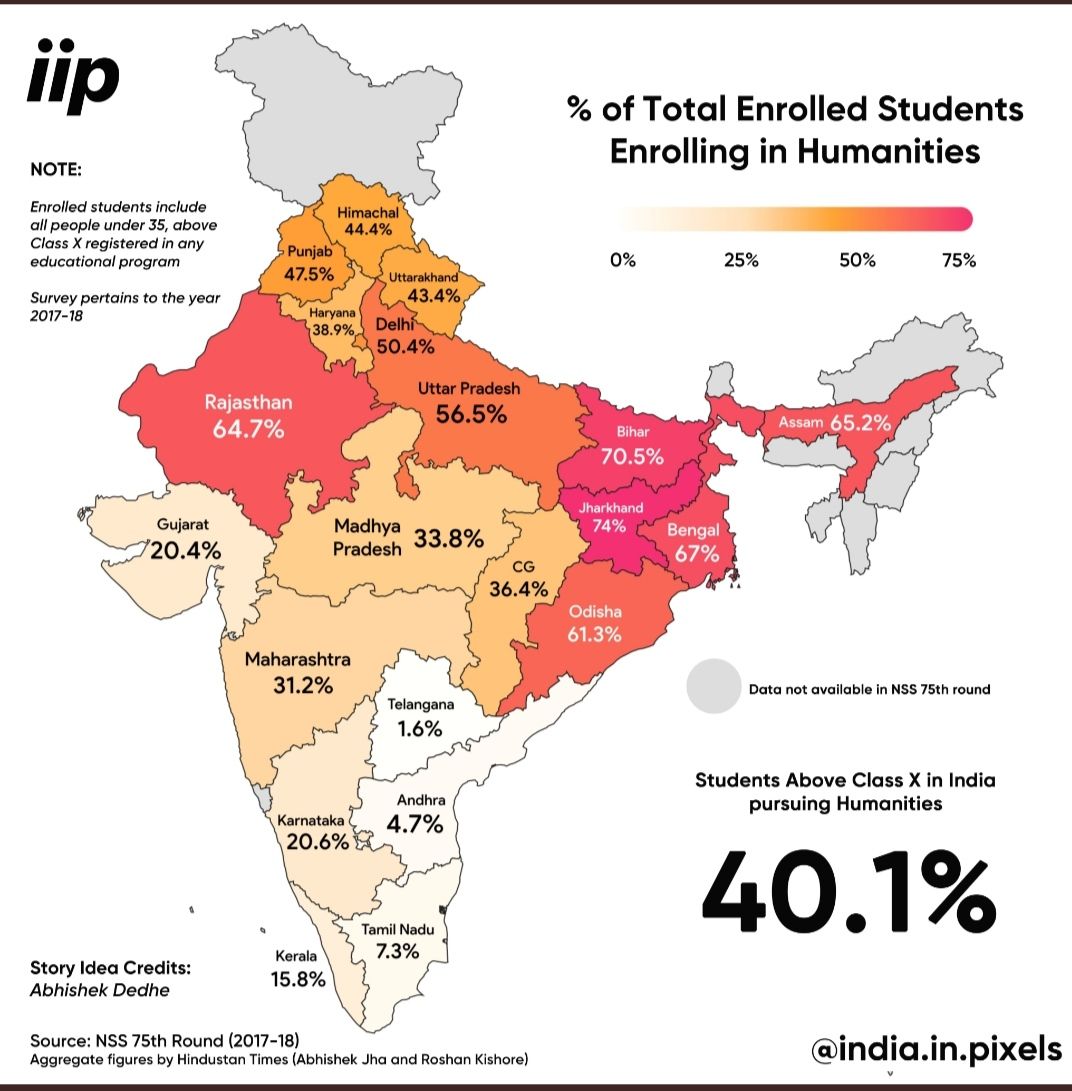 Talented and capable ones leave India. Rich ones monopolize and gatekeep jobs and entry into industry (caste, religion, economic status, nepotism, skin color, etc.) and opportunities so much (Shreyas Iyer or Tamil Directors hiring only Mallu actresses for their movies for example). Large educated pool of talent wasting their life on meme exams and dead end jobs. Many reasons. Look at this map in the south. Humanities degree is struggling. (Can't find data). Science without Humanities is the kind of shit that leads to Nuclear Bomb or nonsense like AI.