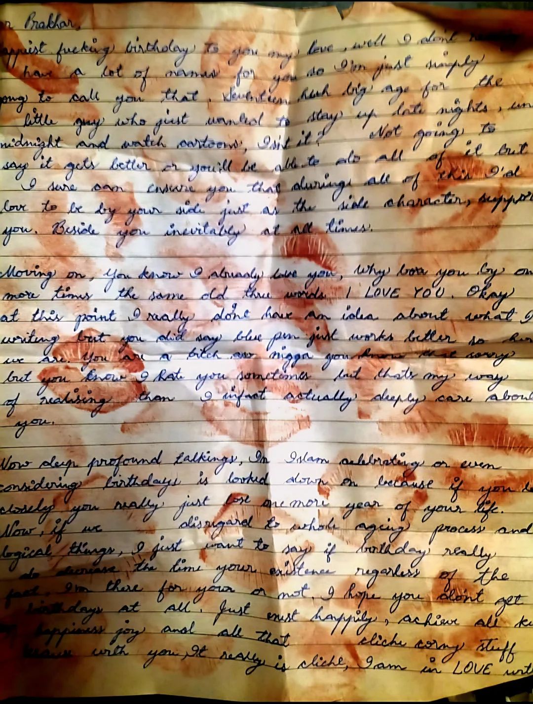 >covered with lipstick marks