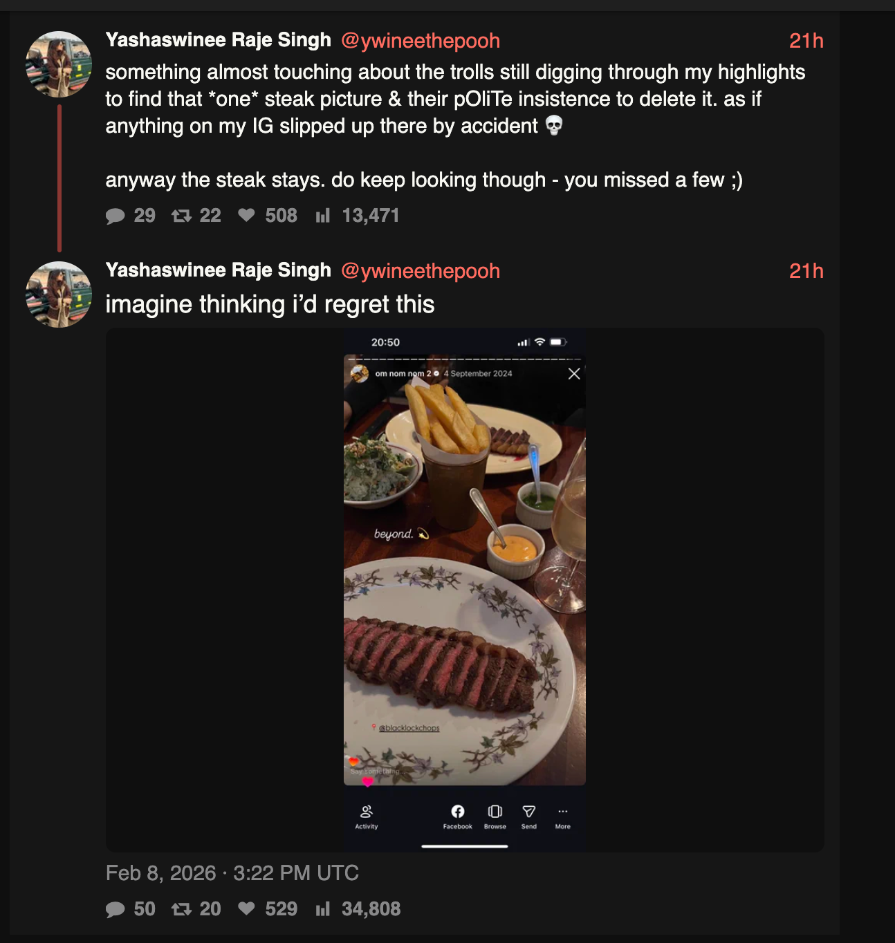 All her posts boil down to: my dad stole money from poor people in India that makes me better than you.