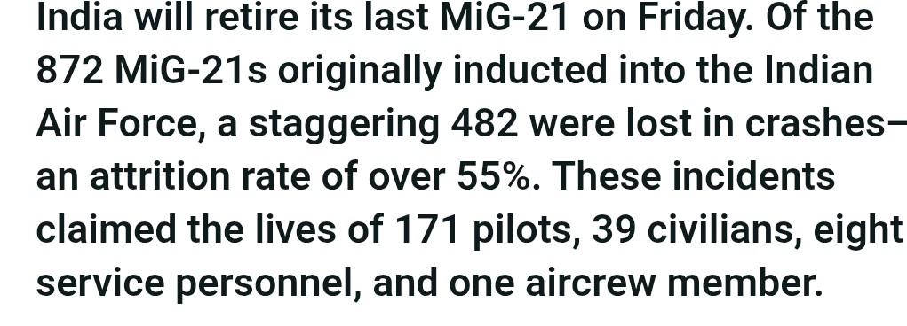 another small but major reason for mig21 crash, it's one of the bloody difficult aircraft without any FBW system going supersonic like a rocket. iaf didn't have intermediate jet trainers so newbies went from prop to sub sonic then complete supersonic missiles cum aircraft like migs.
