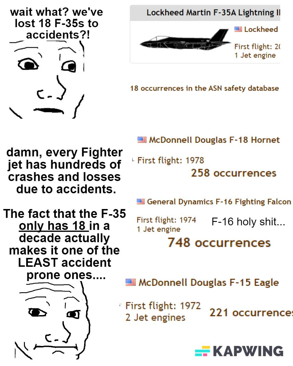 mig21 was pushed beyond its service life in many cases, iterated upon. when you check or compare the stats with any other fighter jet which has operated you will see thousands of crashes etc. in 6 decades - pic related redditors trying to make f35 seem good showcase F16 700+ crashes alone.